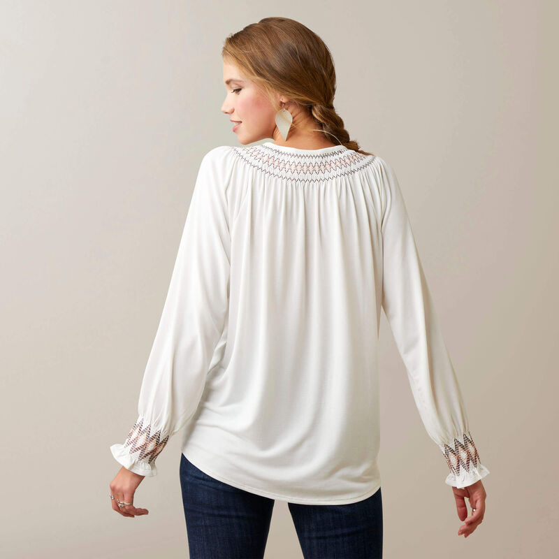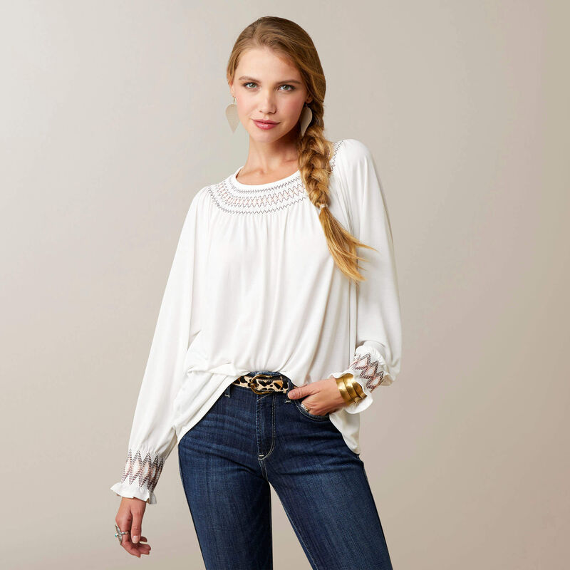 This simple tunic may have fun feminine details, but it's easy to wear with just about anything. Intricate embroidery and stretchy smocking along the sleeves and neckline put a classic western-inspired finish on any outfit.