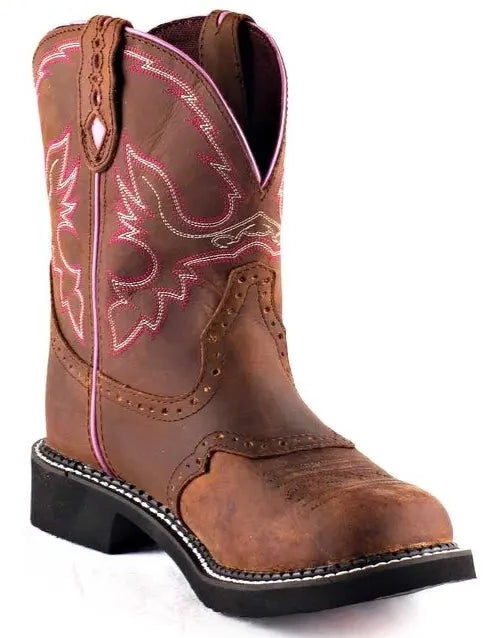 Ladies, check out the Justin Women's Aged Bark Gypsy Western Boot L9903. You'll be lookin' good while feeling great in these Gypsy's. Pink diamond cut pull strap helps you slide the 8" upper on with ease. Now that you've got them on, you won't want to take them off because of the patented J-Flex Flexible Comfort System with removable orthotic insert. This is leather-covered cushioned insole and triple density insole board. It will feel as if we have already broken them in for you. Feel free to love your boots, we do!
